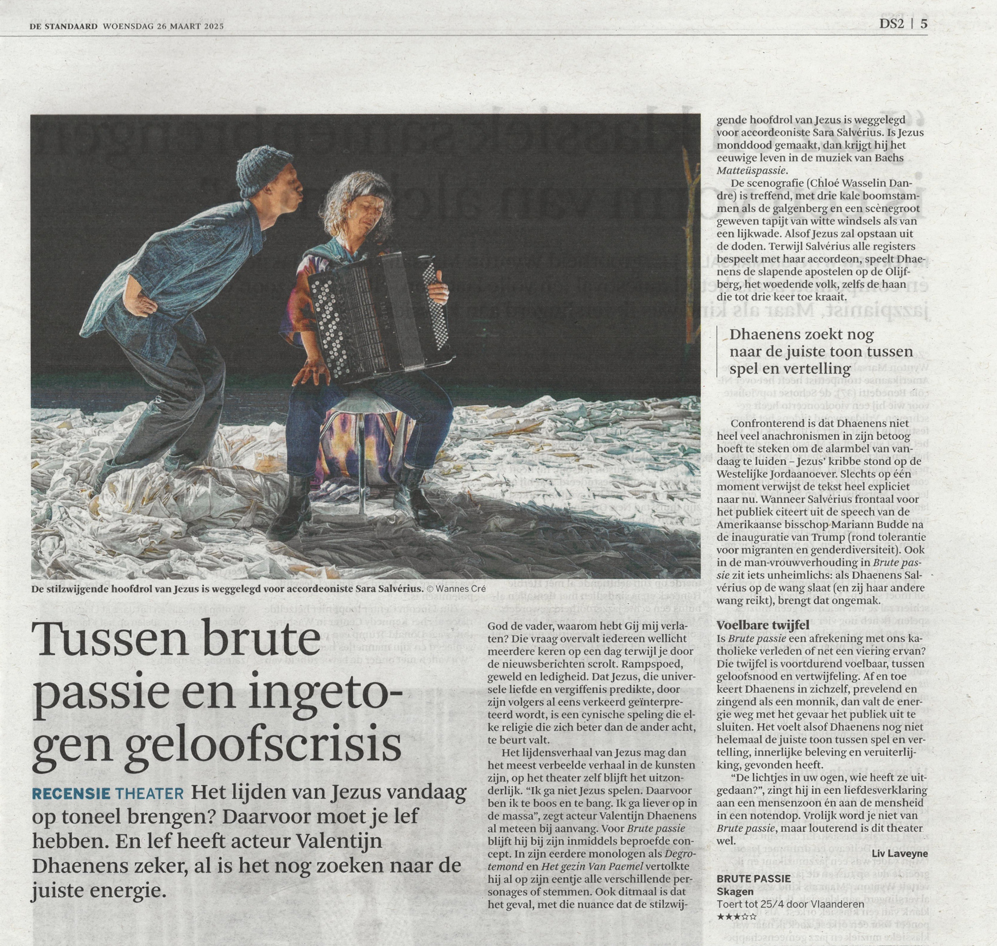 Sara et Valentijn se sont rencontrés lors de la création de Het Gezin Van Paemel (2021). Ils partagent une fascination pour la souffrance en tant que thème musical et en tant que phénomène dans l'histoire (de l'art), dans le monde d'aujourd'hui et dans leur vie personnelle. Ensemble, ils cherchent leur chemin à travers l'agonie de la Passion avec l'espoir tranquille d'une compréhension et d'une connexion.