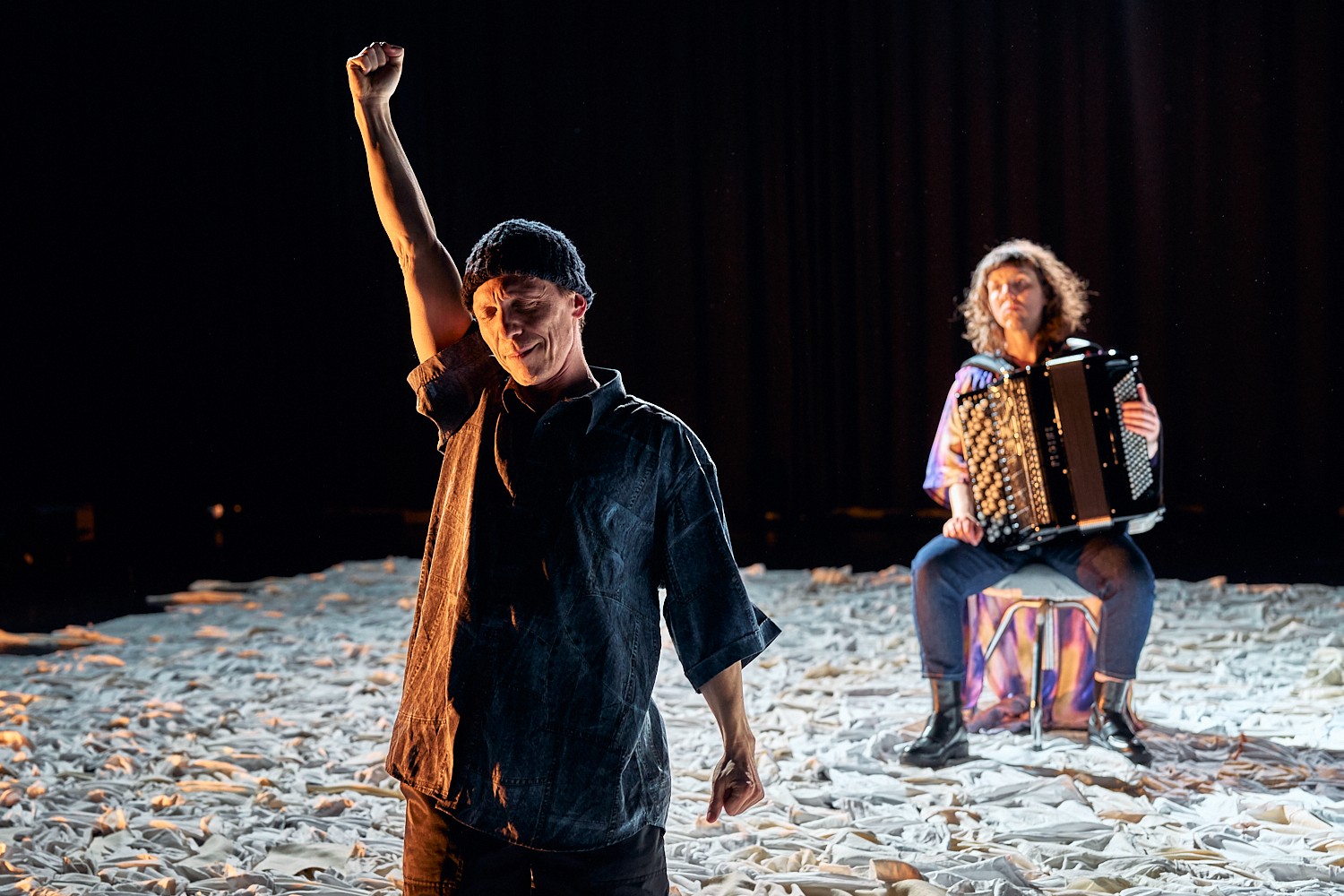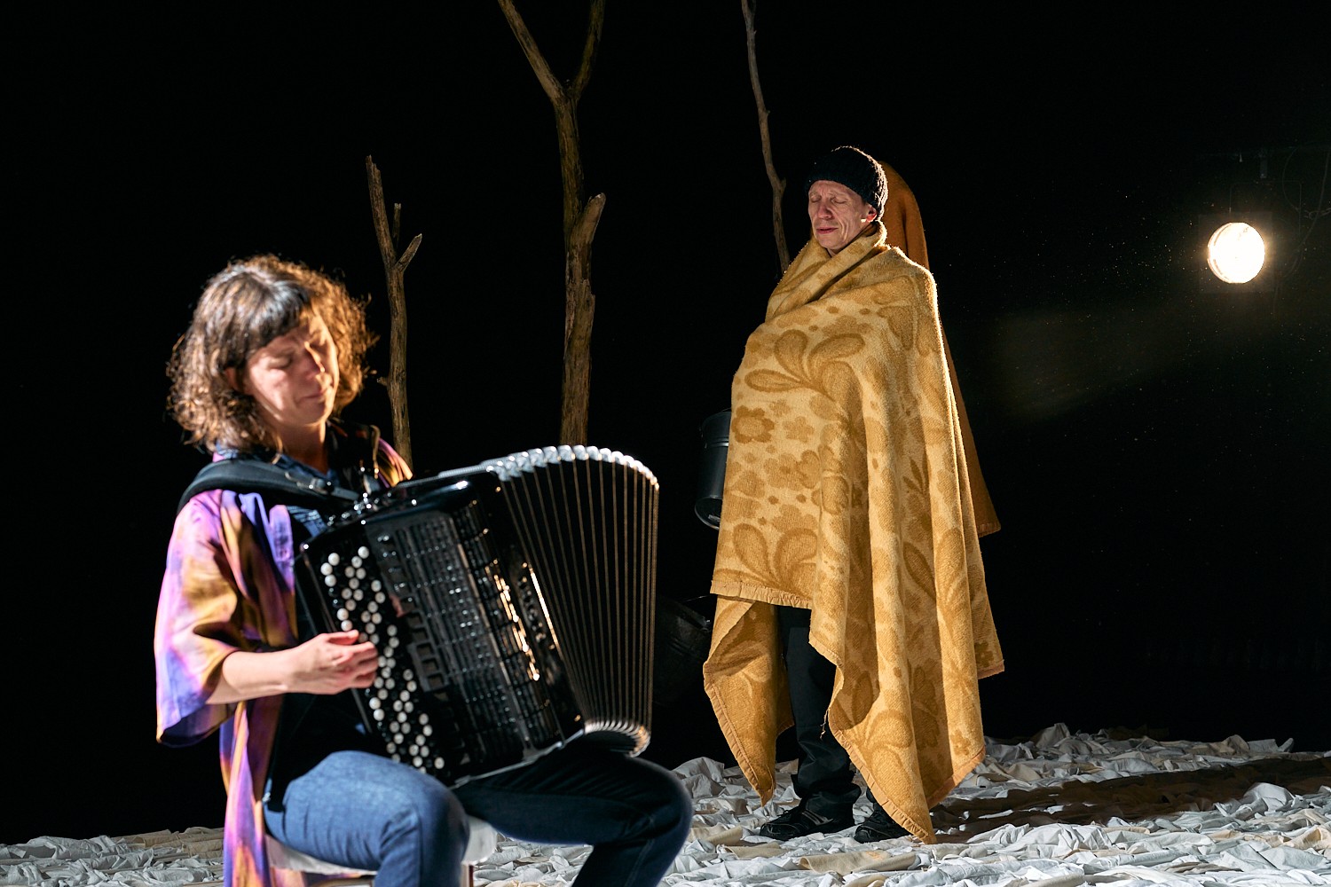 Création : Sara Salvérius (accordéon & jeu), Valentijn Dhaenens (concept & jeu) et Chloé Wasselin Dandre (scénographie & costumes)