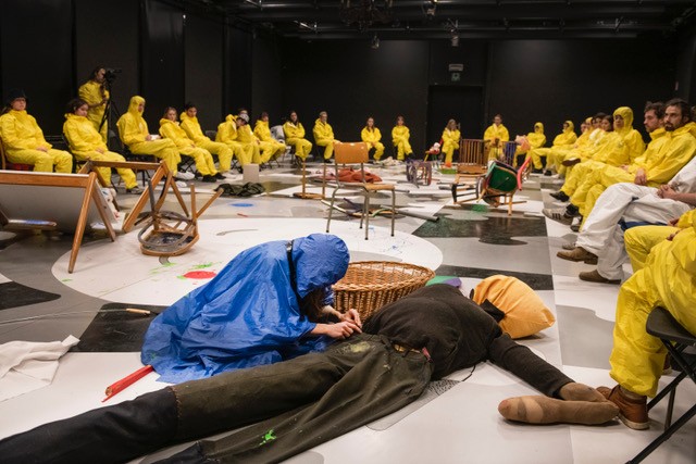 Les installations de Richard Jackson s’inscrivent dans l’action painting et expriment souvent une conséquence: que reste-t-il, qui soit visible, après une action physique puissante? Dhaenens et van den Broek se laissent atteindre en tant que performeurs par l’œuvre de Jackson et se rapportent au contexte créé par l’artiste.